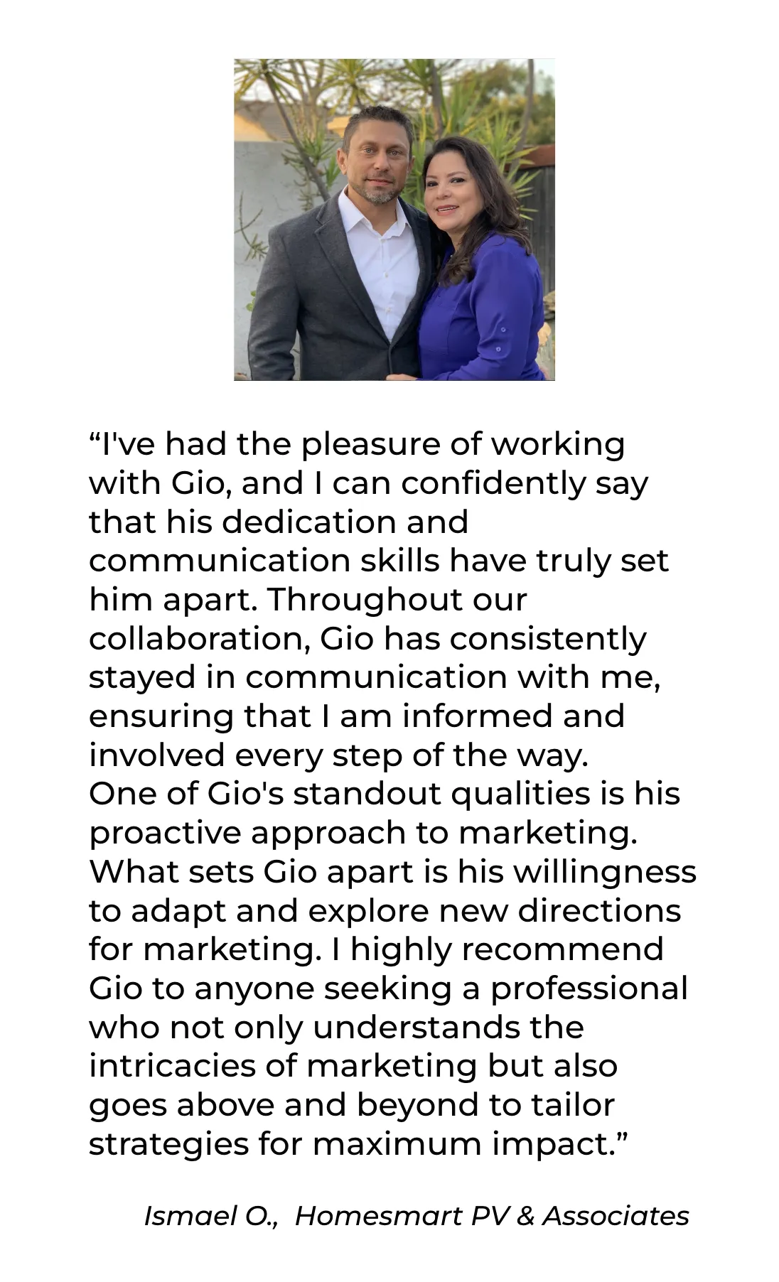 “My experience with Gio and his company Skyline Coast Media has been forthright right from the start. Gio is very proficient in knowing his business, and generating leads that obviously translate to my business….And then I’m able to work those leads and turn them into clients, and put them in escrow. I've received a plethora of a response coming from our initial launch date, which has only been a just a little bit over a week now…..I’m very pleased with the results thus far, and I look forward to a longstanding relationship…”